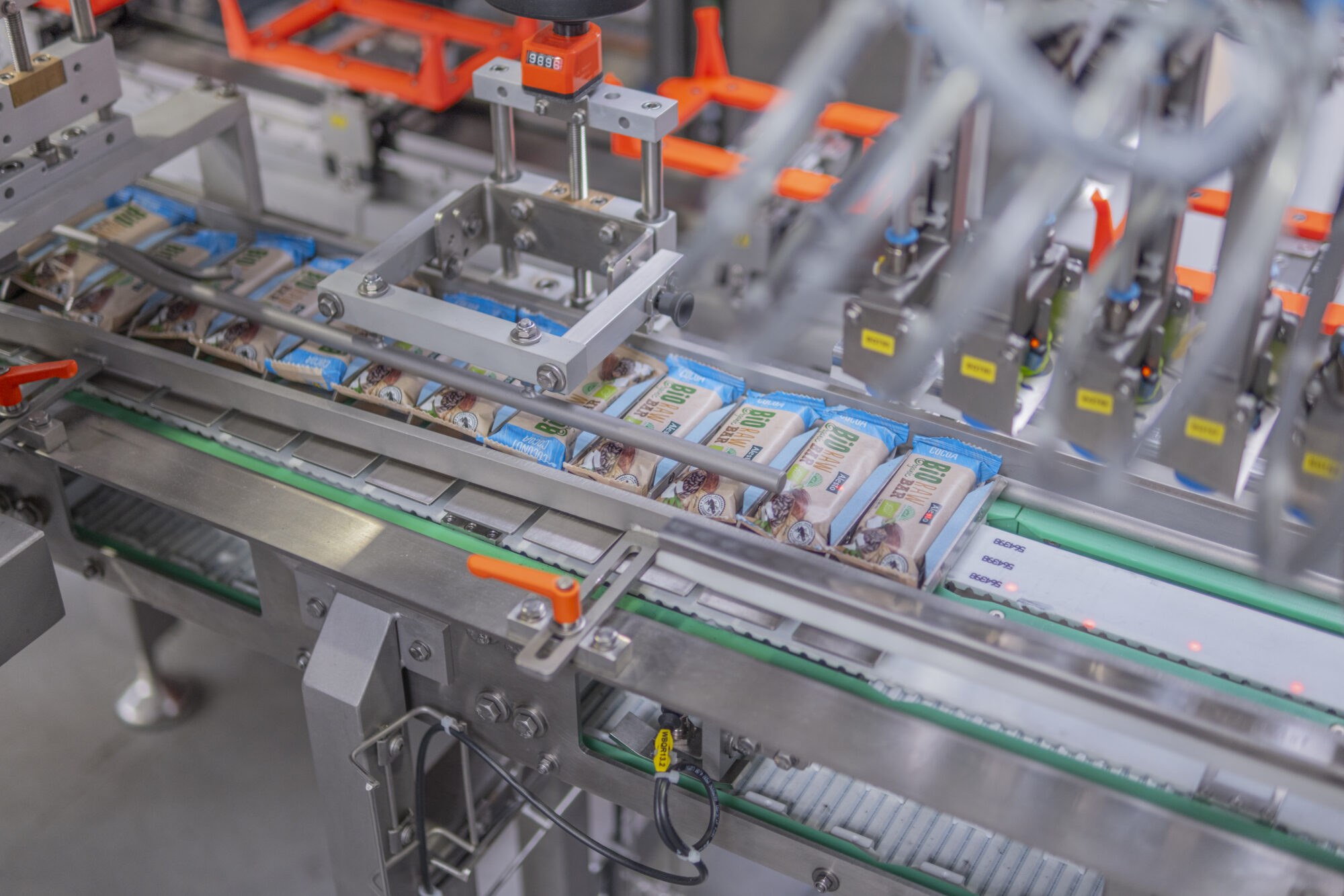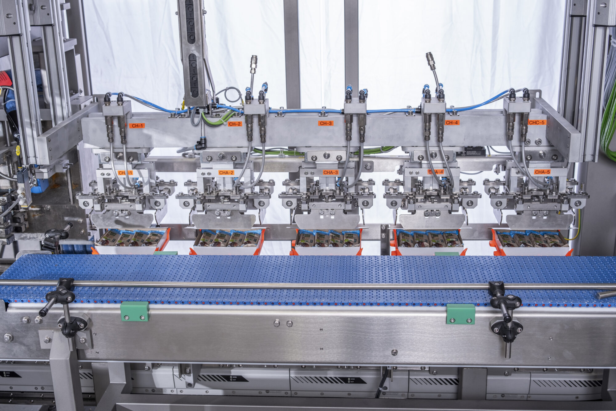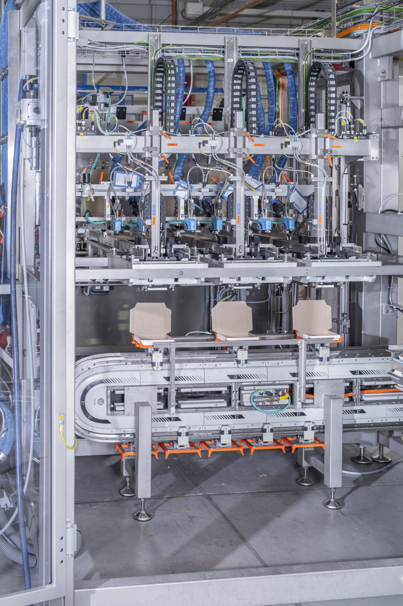 De multifunctionele kartonneermachine is de ideale oplossing voor het efficiënt verpakken van repen in kartonnen dozen met verschillende configuraties van productlagen in de doos. De magnetische aandrijving zorgt voor een stille, nauwkeurige werking en de mogelijkheid om elke transportlade afzonderlijk te positioneren. Drie onafhankelijke vormkoppen maken dozen direct op de productielijn. Het pick-and-place-systeem plaatst de producten vervolgens snel en nauwkeurig in deze dozen met behulp van de top-load-methode. Nadat ze met hete lijm zijn verzegeld, worden de dozen via een transportband naar de palletiseereenheid getransporteerd. Het resultaat is een elegante, compacte, hoogwaardige secundaire verpakkingsoplossing die klaar is voor moderne productie.