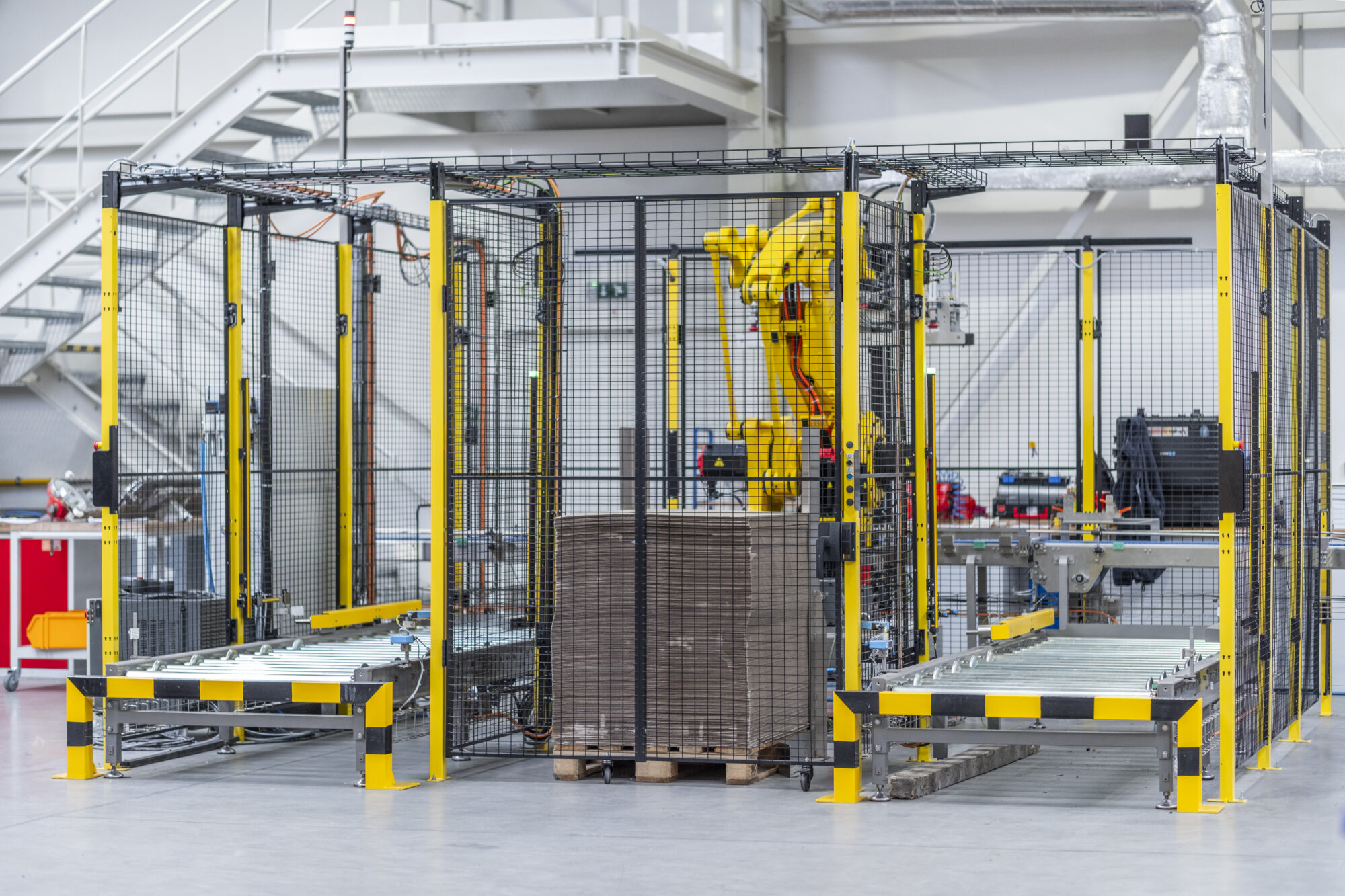 Volledig geautomatiseerde oplossing voor het secundair verpakken van repen in kartonnen dozen en het vervolgens palletiseren ervan.